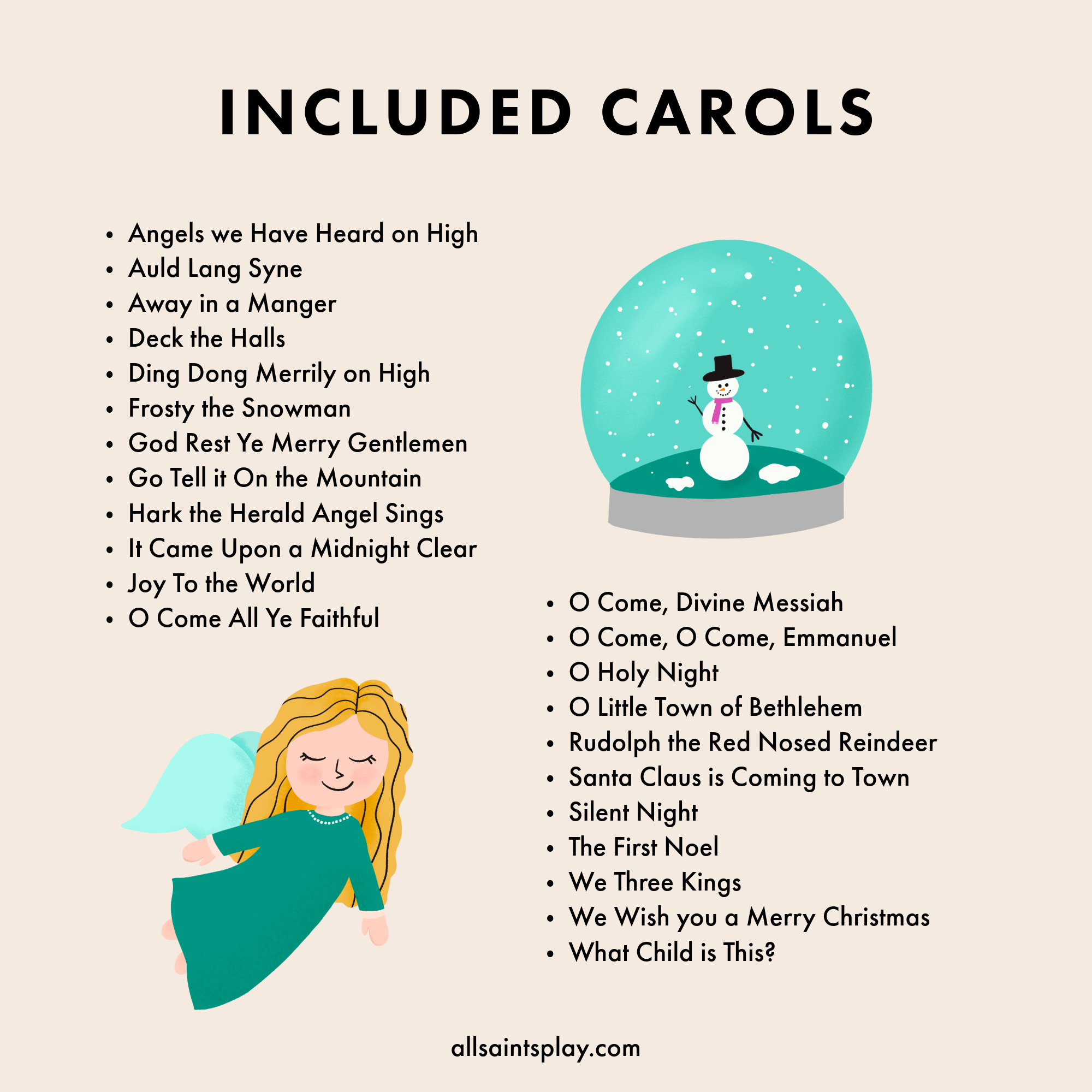 Get your caroling party started with A Little Book of Christmas Carols! 23 beloved Christmas carols for you and your family and community to enjoy together. In this booklet you will find the Christmas carol lyrics along with joyful illustrations to go along with them.