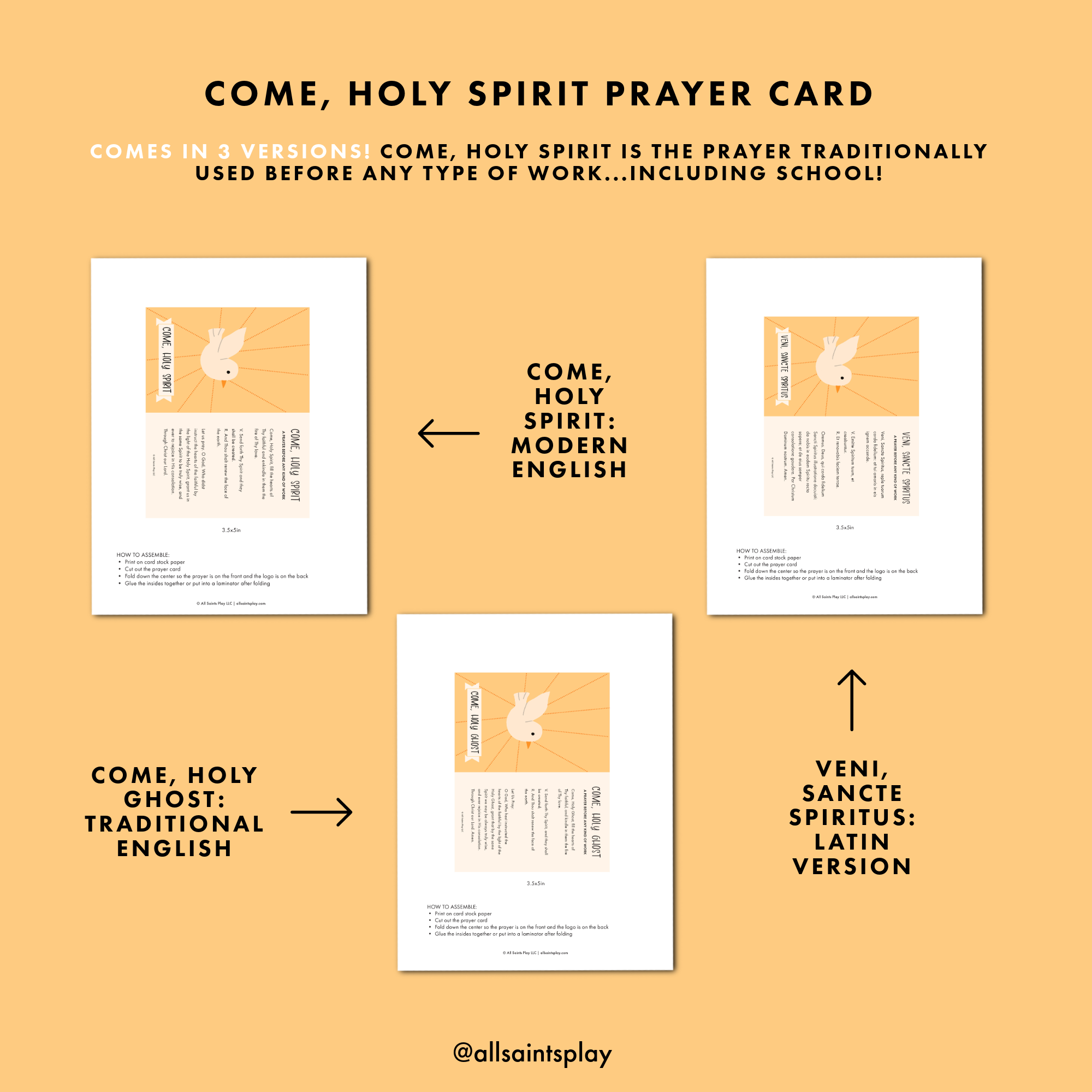 Come, Holy Spirit Prayer Card (3 versions: English, Traditional, & Latin)