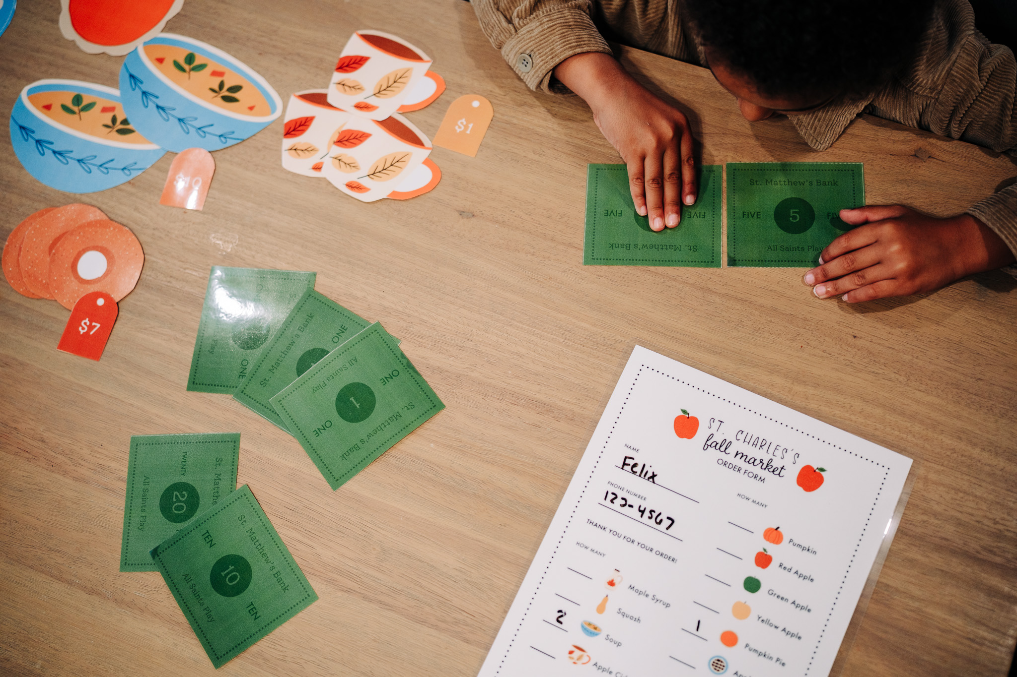 • Dramatic play printables: St. Charles’s Fall Market stand, order forms, play money, price tags, banners, and role-play props